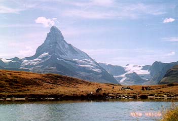 ライ湖とマッターホルン “マッターホルンが最も美しく見える場所”からの眺め。小さな湖のほとりではハイキング中の人々がマッターホルンを見ながら休んでいる。 |